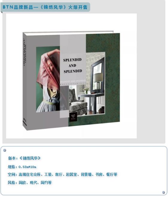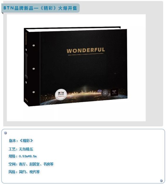 本次會議,BTN新品《錦繡風華》《精彩》的發(fā)布及品鑒是重頭戲,《錦繡風華》為150g圓網(wǎng)系列,以素色為主,豐富和圓潤的灰色調(diào)加水性糊料印刷的精彩演繹,使該版本顯得頗具內(nèi)涵;《精彩》為無紡精壓系列,素色為主,搭配少量花型,滿足房地產(chǎn)精裝修及現(xiàn)代普通家裝的需求。